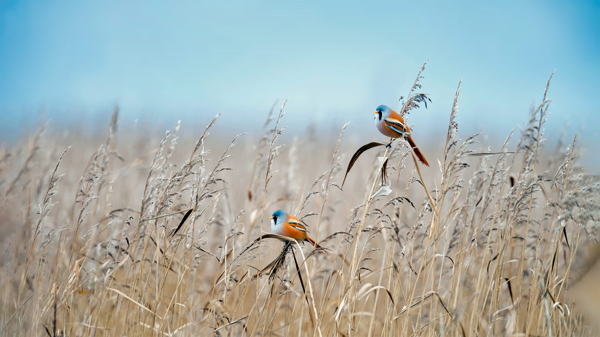 Bearded reedlings at a wetland in Flevoland, 荷兰 (© Gert-Jan IJzerman/Minden Pictures)