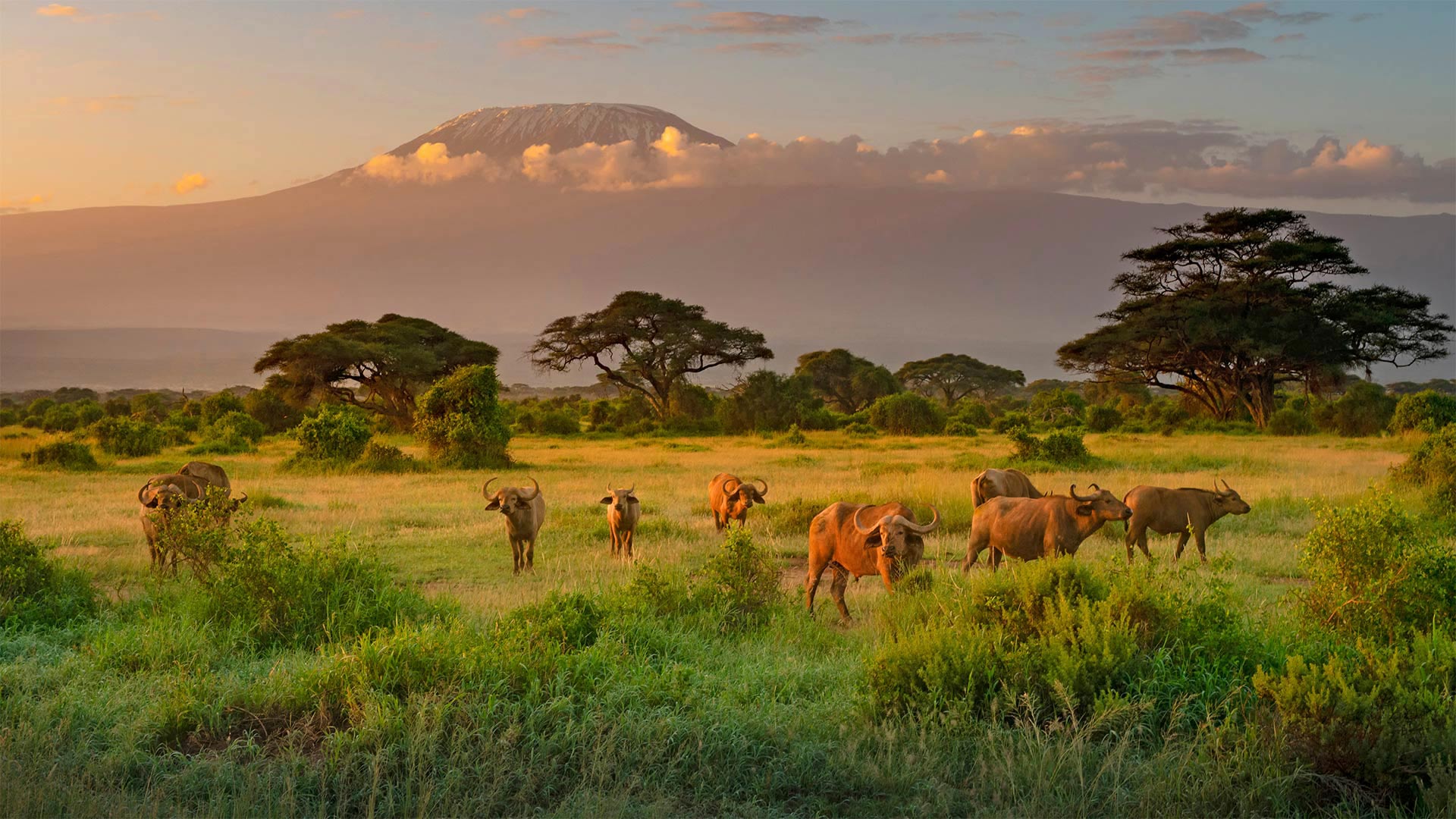 乞力马扎罗山 with Cape buffaloes in foreground, Amboseli Biosphere Reserve, 肯尼亚 (© RealityImages/Shutterstock)