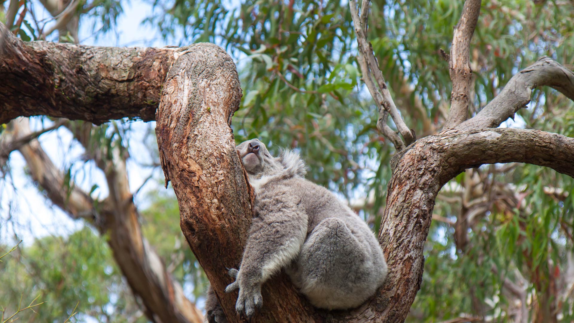 A koala sleeping in a eucalyptus tree